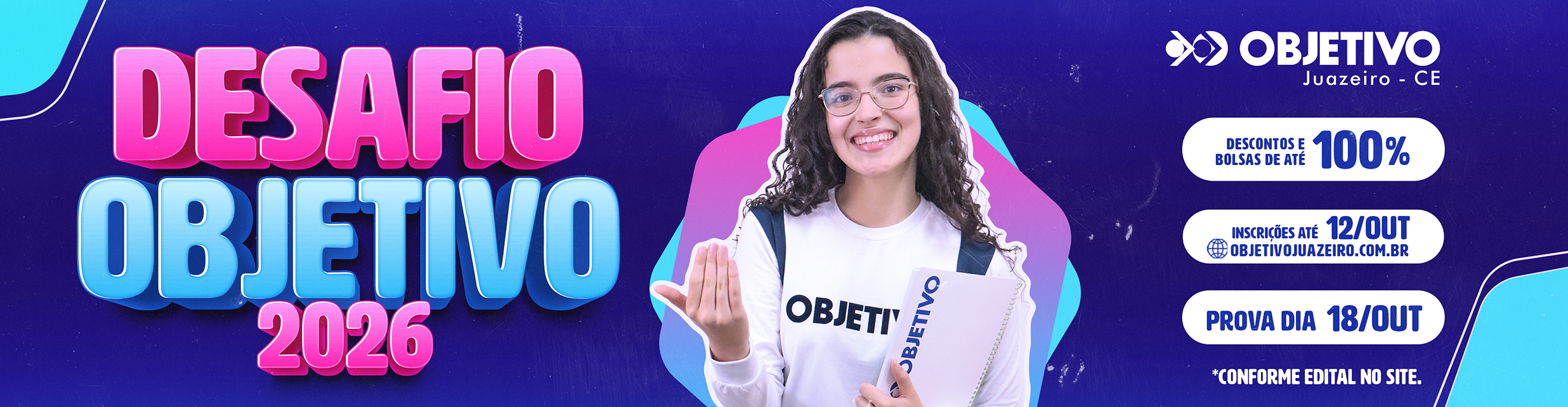 As inscrições para o Desafio Objetivo 2026 são gratuitas e devem ser feitas exclusivamente pelo site www.objetivojuazeiro.com.br, nesta página Desafio 2026 – Acesso à Área do Candidato, do dia 01 de setembro ao dia 12 de outubro de 2025.